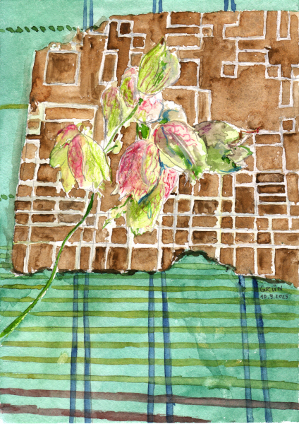 Silene im Quadrat 2025; Aquarell auf Bütten; 24 cm x 17 cm Beginn im Grünen 2021; Acryl auf Malplatte; 30 cm x 24 cm Gestatten: Grün I 2024; Bleistift, Acryl auf Leinwand;50 cm x 50 cm Wind und Welle 2023; Acryl auf Malplatte; 30 cm x 30 cm WiiWi 2024; Acryl auf Leinwand; 60 cm x 90 cm Forêt d’or 2012; Acryl auf Leinwand; 80 cm x 145 cm Grün sieht Grau 2024; Objekt aus Gießkannen, Acryl, Holz; 55 cm x 88 cm x 65 cm Olive und Forelle II 2024; Bleistift, Tusche, Acryl, Lack auf Pappwabe; 100 cm x 70 cm En rörelse i rörelse I 2010; Öl, Acryl auf Leinwand; 140 cm x 100 cm Schwimmerbecken 2024; Aquarell auf Büttenkarton; 17 cm x 24 cm En rörelse i rörelse IV 2011; Öl, Acryl auf Leinwand; 140 cm x 100 cm Schattenkind 2024; Acryl auf Leinwand; 90 cm x 60 cm Reisefieber 2024; Acryl auf Leinwand; 80 cm x 60 cm Reise nach J. 2008; Acryl, Tusche auf Leinwand; 120 cm x 80 cm Rucksack des Landvermessers 2024; Objekt aus Rucksack, Plastikkrähen, Maßbänder; 131 cm x 58,5 cm x 50 cm Ukiyo 2024; Acryl, Bleistift, Tusche auf Leinwand; 80 cm x 60 cm Elefantenohr 2024; Aquarell auf Büttenkarton; 17 cm x 24 cm Sockini 2024; Bleistift, Acryl auf Leinwand; 120 cm x 60 cm Modell für Sockini 2024; Objekt aus Acryl, Kunststoff, Baumwollsocken; 30 cm x 24,5 cm x 21 cm Mädchen, die pfeifen 2024; Acryl auf Leinwand; 80 cm x 145 cm Zwei Krähen zanken 2024; Objekt aus Plastikkrähen, Maßband, Holzplatten; 21 cm x 60 cm x 60 cm Rucksack des Landvermessers Studie I 2024; Bleistift, Buntstift auf Papier; 29,7 cm x 21 cm Paradiesvogel 2022; Acryl auf Leinwand; 30 cm x 24 cm Blatt mit Hundeblick 2024; Acryl auf Pappwabe; 30 cm x 30 cm Landvermesser Studie II 2024; Bleistift, Buntstift auf Papier; 21 cm x 29,7 cm Amaryllis, gefliest 2023; Acryl auf Leinwand; 58 cm x 58 cm Blaues Unterholz 2011; Öl, Acryl auf Leinwand; 80 cm x 145 cm Bunte Regenschirme 2022; Acryl auf Leinwand; 50 cm x 50 cm Feuersalamander 2011; Öl, Acryl auf Leinwand; 80 cm x 120 cm Gedeih und Verderb 2024; Objekt aus Gewächshaus, Leinwand, Keilrahmen; 160 cm x 100 cm x 100 cm Schnittlauch 2022; Acryl auf Malplatte; 20 cm x 20 cm Heimsuchung Mariae 2007; Öl, Acryl auf Leinwand; 160 cm x 120 cm Kleine Nachtblüte II 2024; Öl, Acryl auf Leinwand; 30 cm x 40 cm Krähenschreck 2024; Linoldruck, Aquarell auf Druckbütten; 14 cm x 13,5 cm Kröte im Grünen 2011; Acryl auf Leinwand; 80 cm x 120 cm Blaues Unterholz, Leinwand 2011; Öl, Acryl auf Leinwand; 80 cm x 145 cm Winterlicht 2011; Öl, Acryl auf Leinwand; 80 cm x 145 cm Rote Fledermaus 2022; Acryl auf Malplatte; 30 cm x 24 cm Pommesbude 2023; Filzstift, Fineliner auf Papier; 19,2 cm x 28,6 cm Taucher 2019; Linoldruck auf Druckbütten; 21 cm x 13 cm Paprika-Herz-Kreislauf 2023; Aquarell auf Büttenkarton; 48 cm x 36 cm Lichtung, Licht 2011; Öl, Acryl auf Leinwand; 80 cm x 145 cm Schach, später 2023; Acryl auf Leinwand; 60 cm x 80 cm Schloss innen/Inventar Studie IV 2024; Bleistift, Buntstift auf Papier; 21 cm x 29,5 cm Schnee-Ball 2021; Acryl auf Malplatte; 30 cm x 24 cm Sneakers on Canvas 2023; Acryl auf Leinwand; 120 cm x 60 cm Muscheltusch IV 2022; Aquarell auf Büttenkarton; 21 cm x 29,6 cm